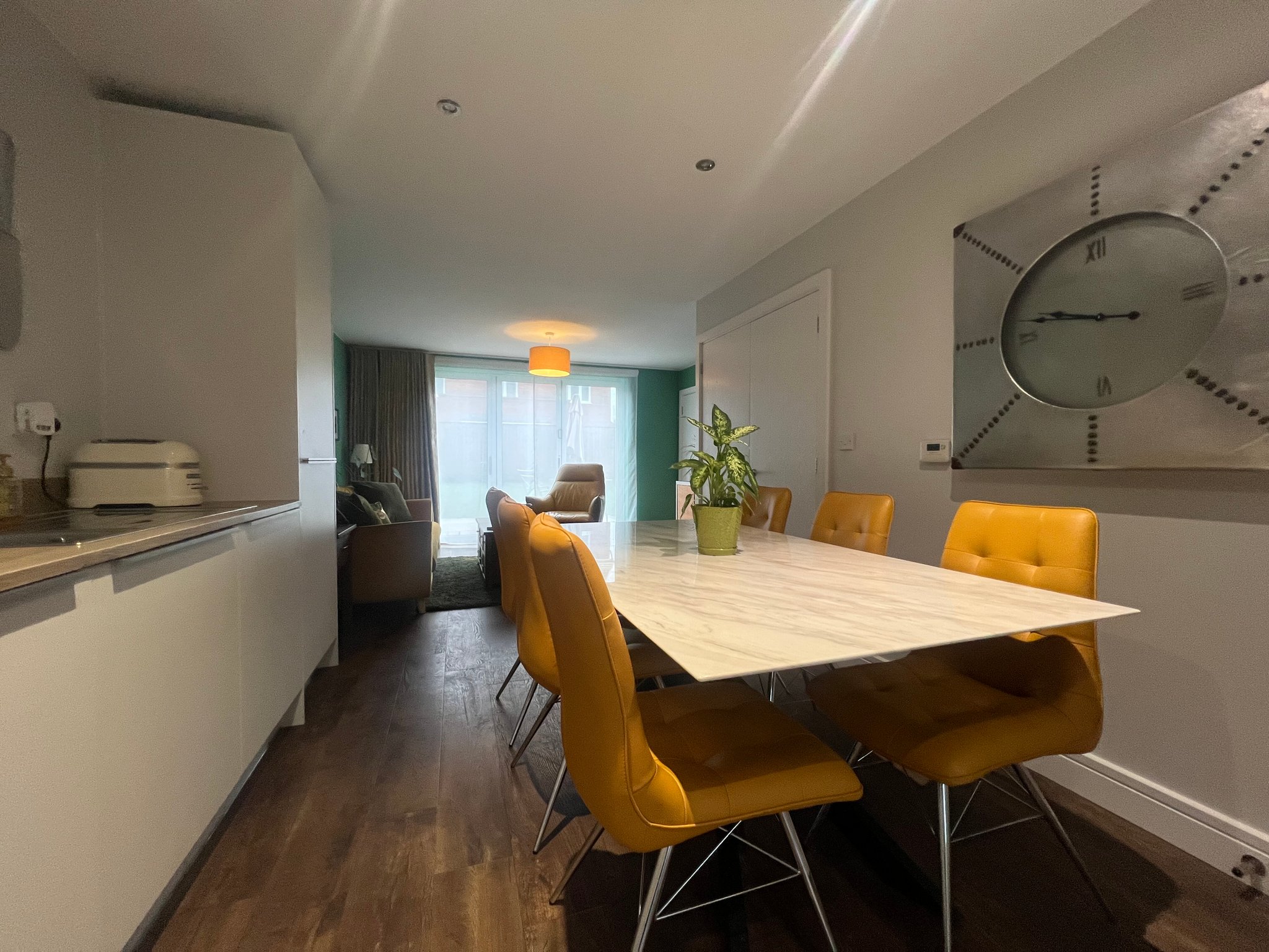 There is a large entrance hall providing access to the first-floor accommodation and the open-plan kitchen, dining and living area, featuring wood-effect flooring, a radiator and a single pendant light fitting, creating a warm and welcoming first impression.