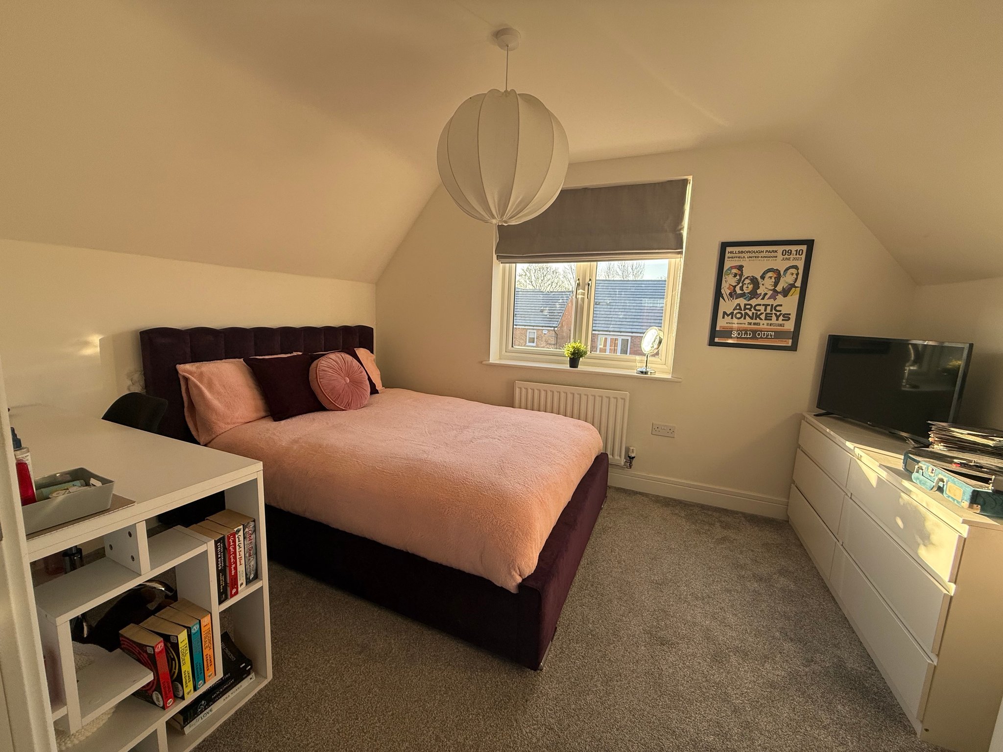 Bedroom Four is another generously proportioned double bedroom, featuring a window overlooking the rear garden, carpeted flooring, a single pendant light fitting, and a radiator, creating a bright, comfortable, and inviting space.