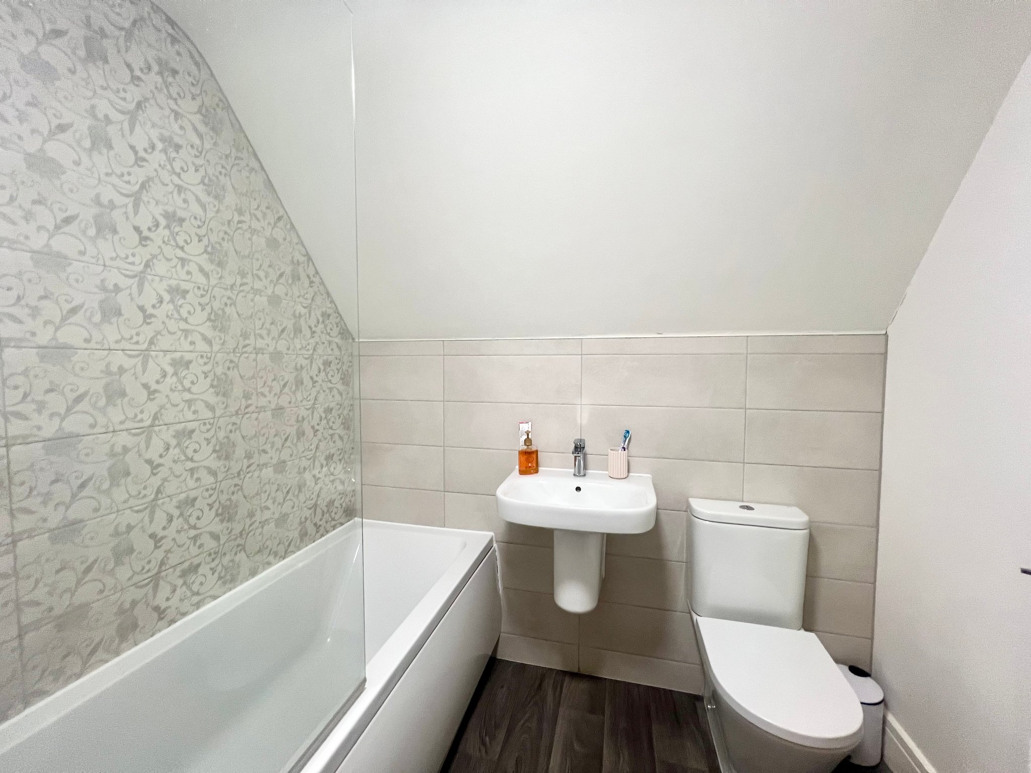 The family bathroom on the top floor is modern and spacious, featuring a bath with an overhead shower, WC and hand basin, complemented by a radiator and wood-effect flooring. A side-facing obscure window provides natural light while ensuring privacy, and a single pendant light fitting completes this stylish and practical family space.