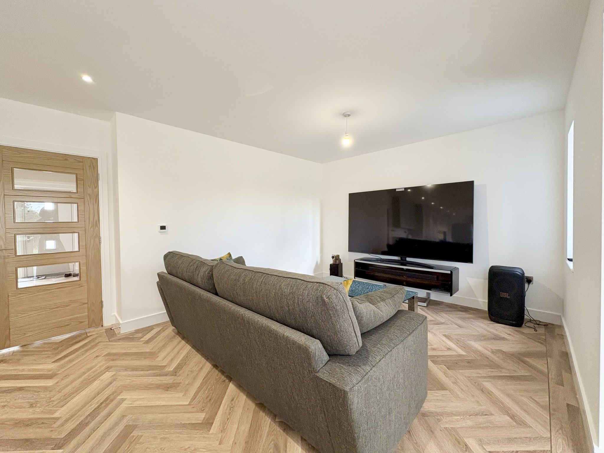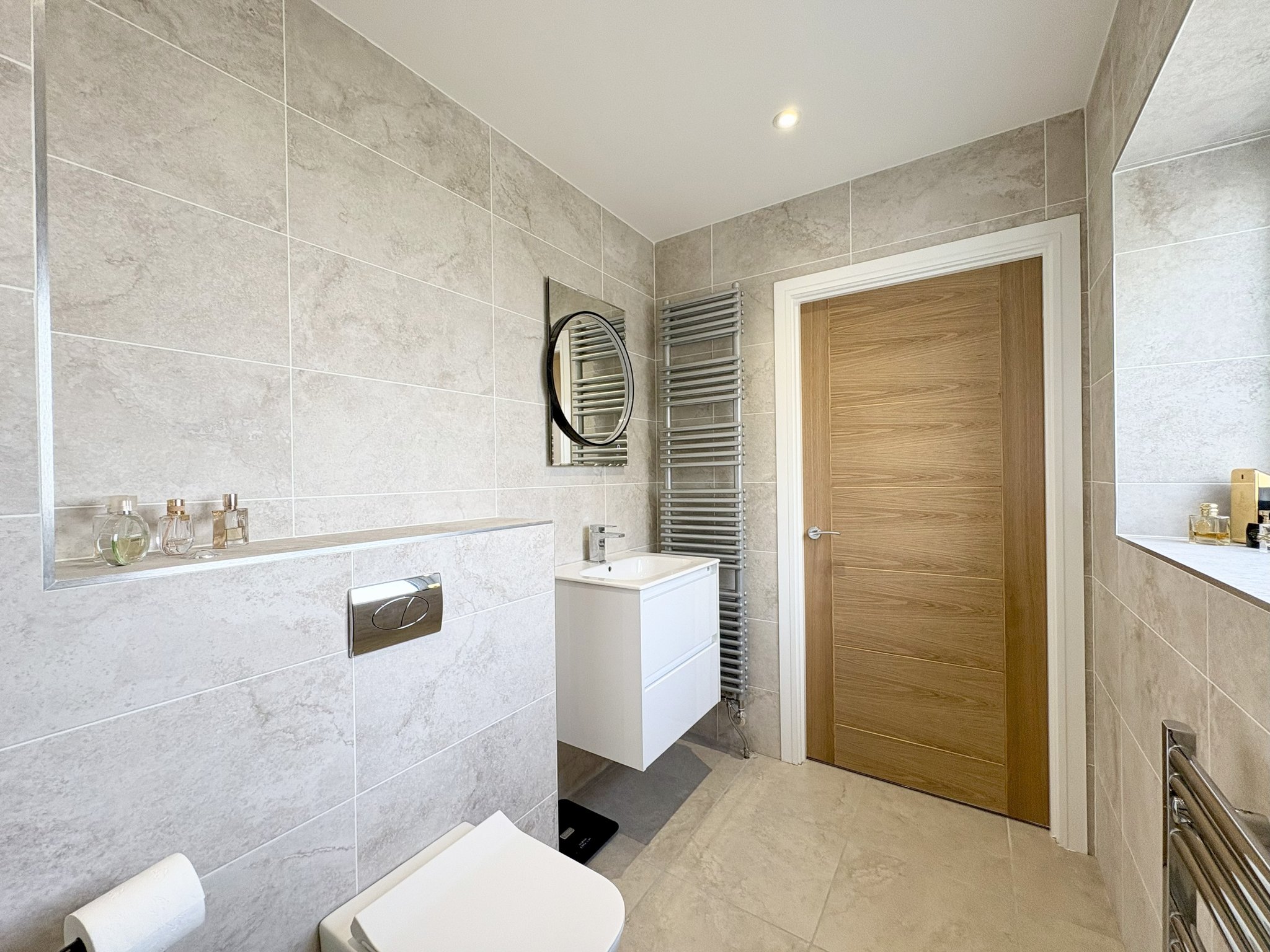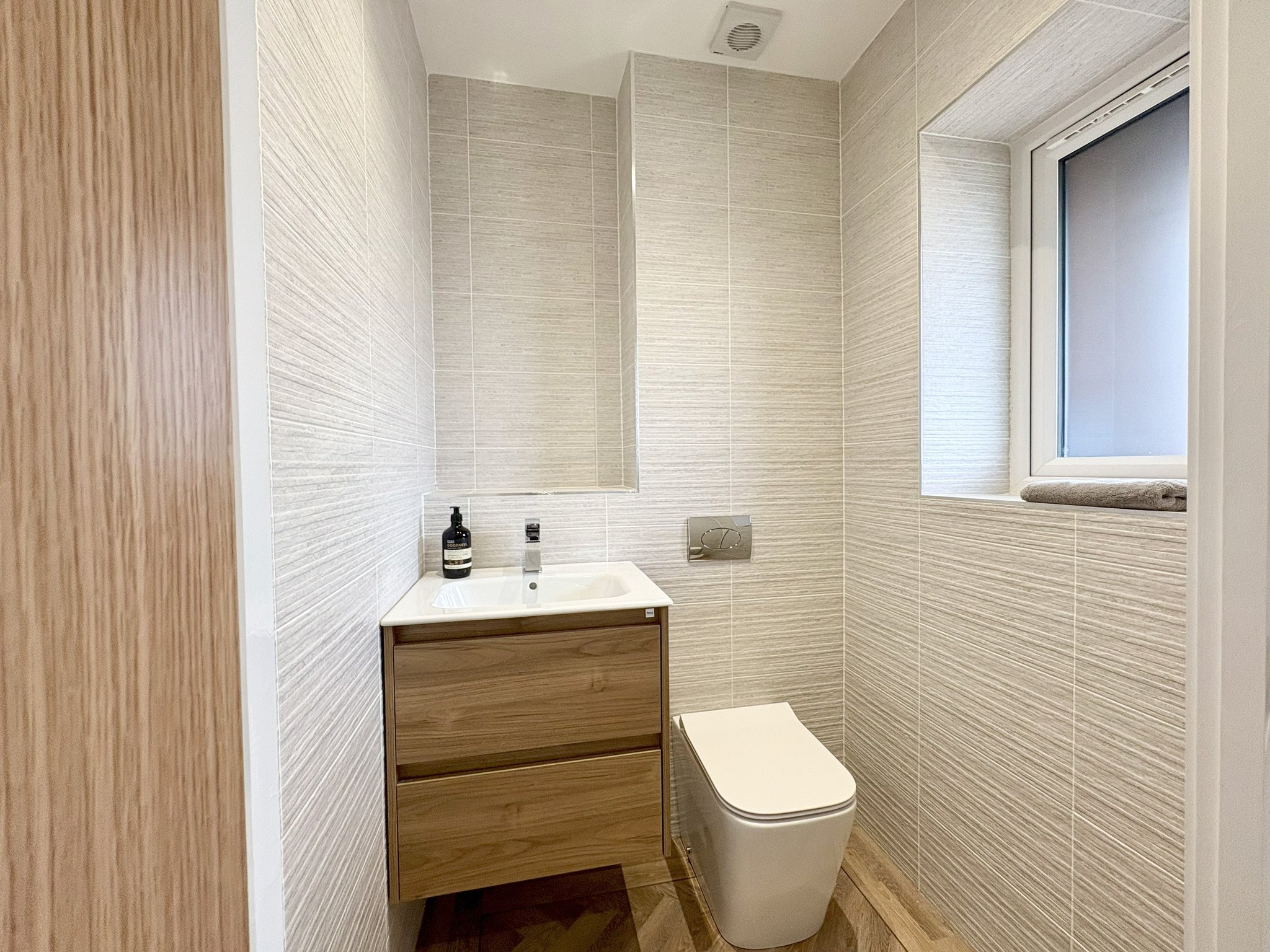 The downstairs WC is located off the main entrance hall and features a front-facing window that allows natural light to brighten the space. It is fitted with a modern wash basin and WC, is fully tiled for a sleek, low-maintenance finish, and benefits from the same high-quality Karndean flooring found throughout the ground floor.