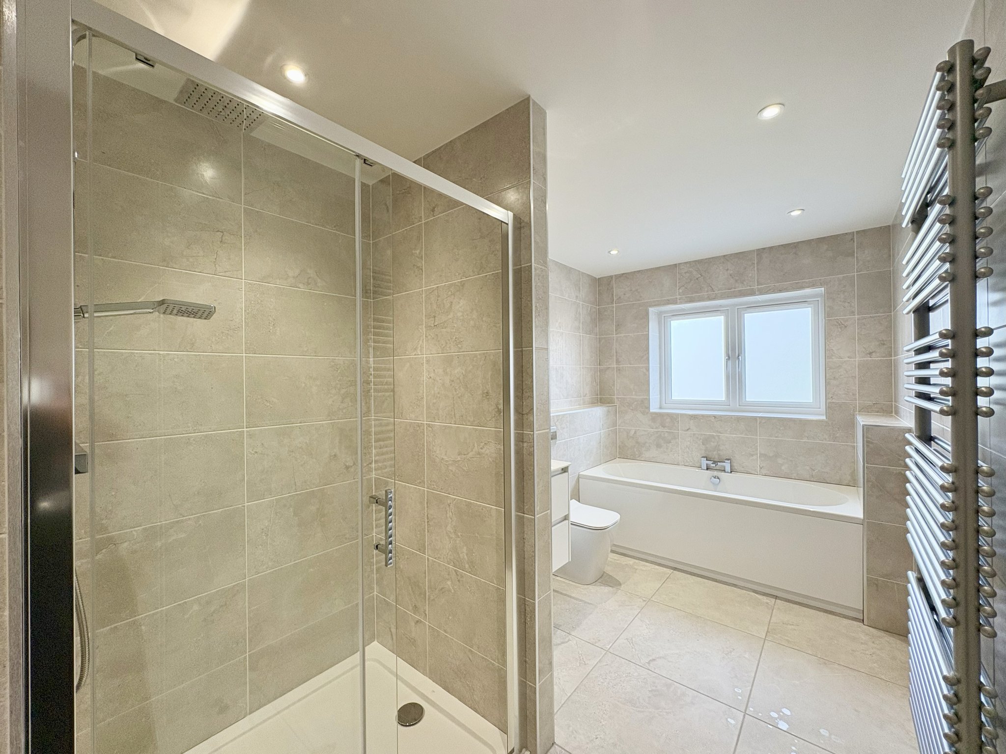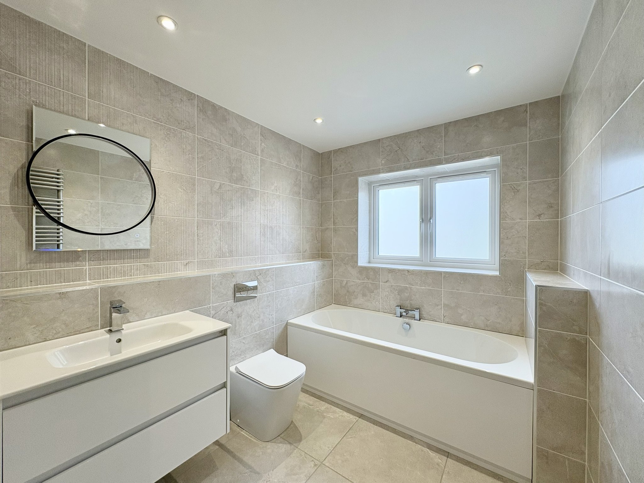 The modern family bathroom is beautifully finished and offers both style and functionality. It features a double shower, a separate bathtub, a contemporary sink with a light-up mirror, a WC, and a chrome radiator towel rail. Fully tiled throughout, the bathroom also includes a rear aspect obscure window, providing natural light while maintaining privacy.