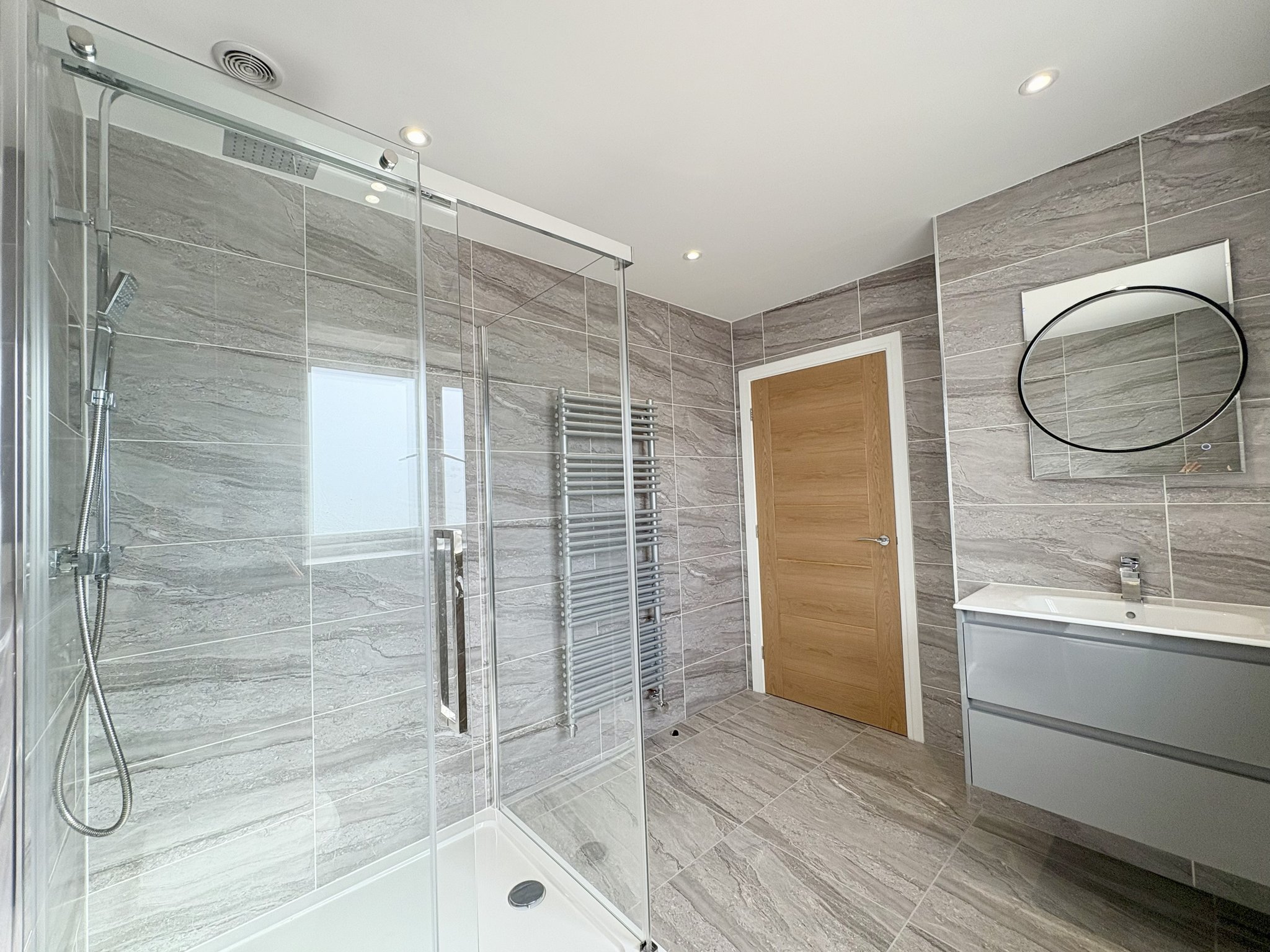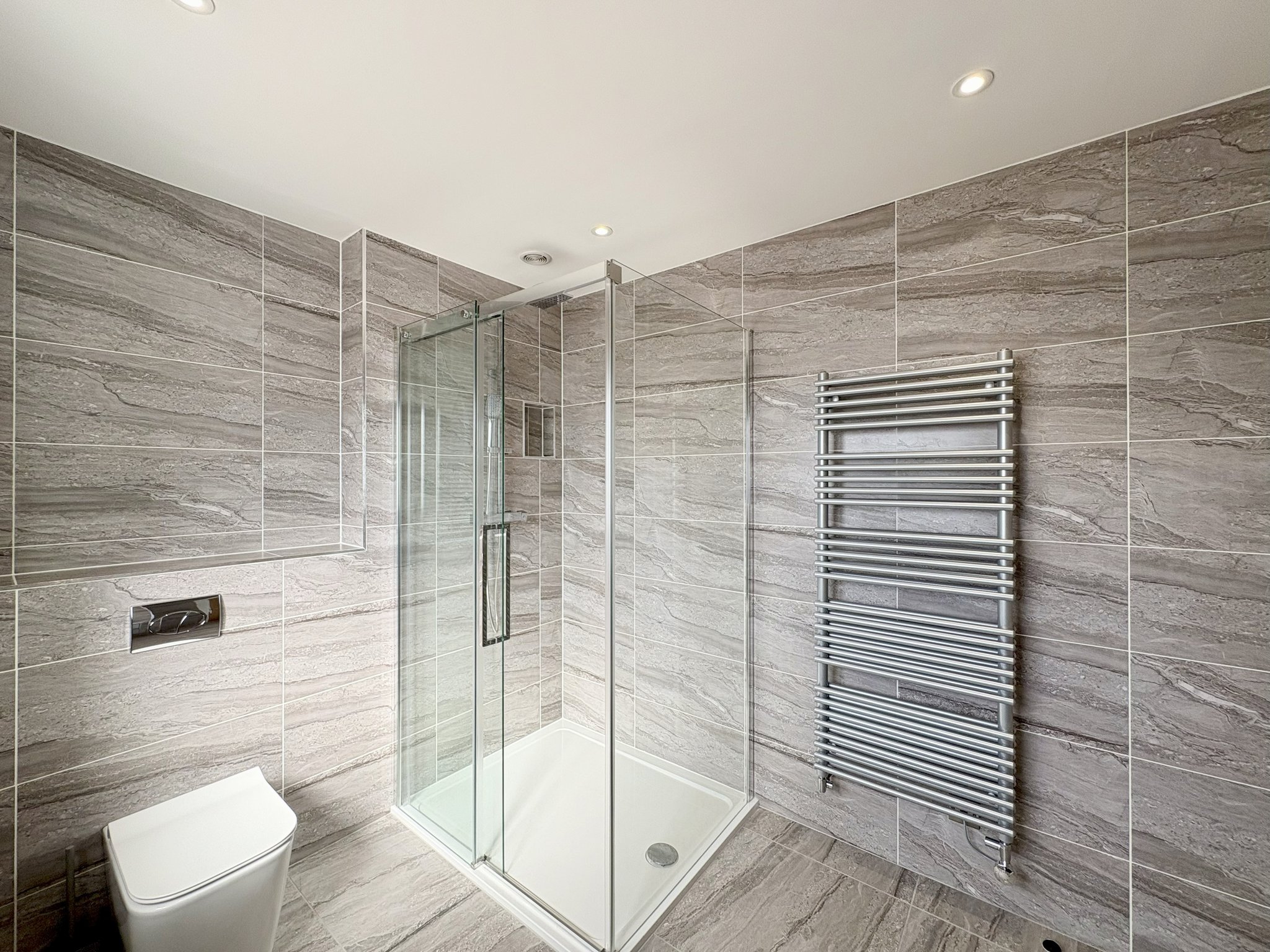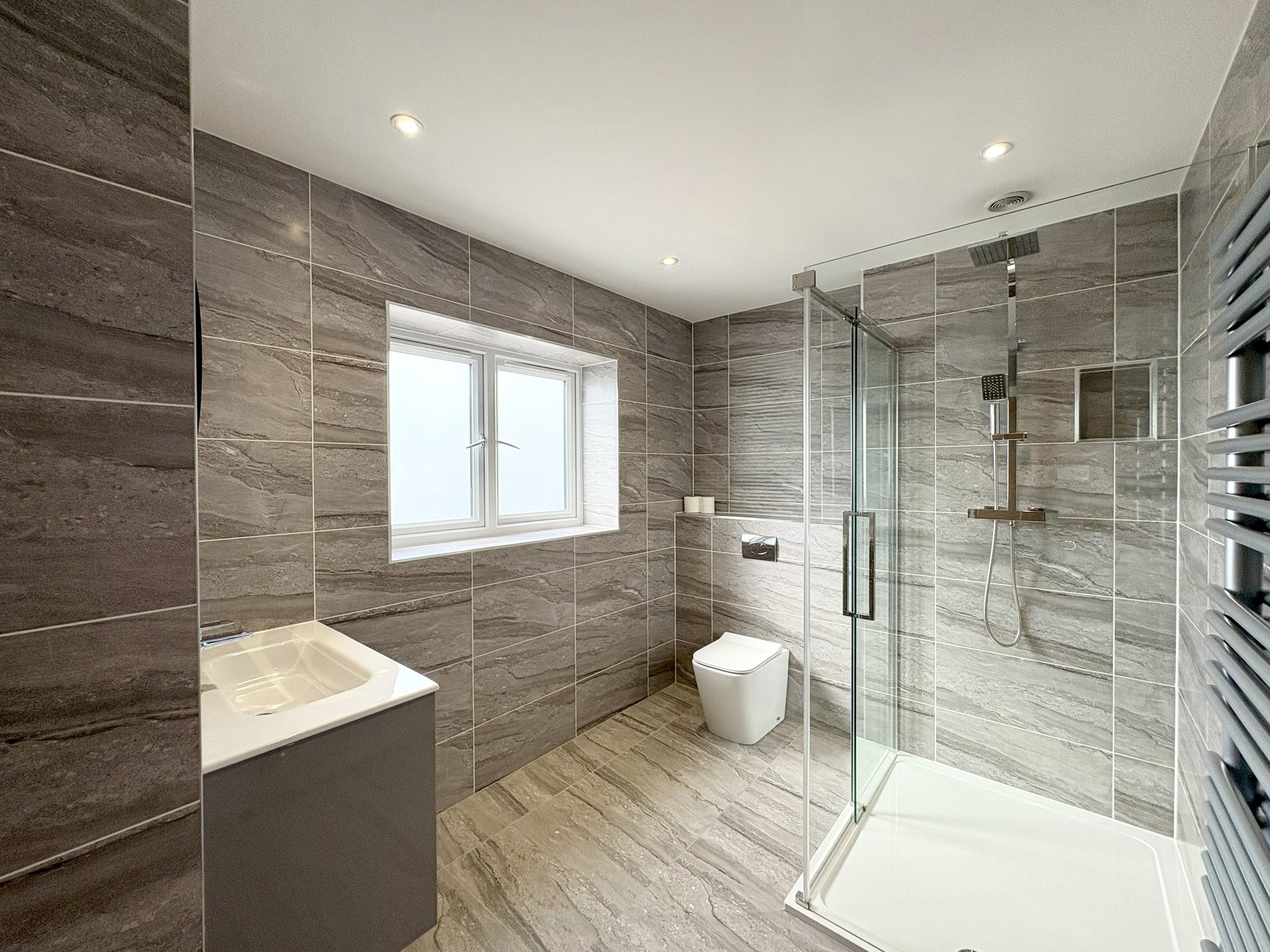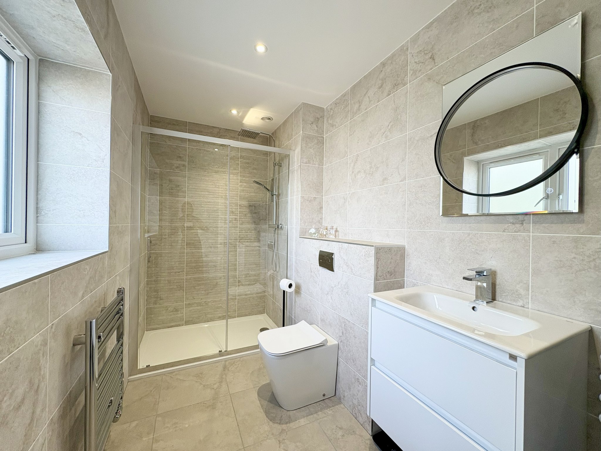 The en-suite bathroom features a spacious double shower and a rear aspect obscure window that ensures privacy while allowing natural light to filter in. It is fully tiled for a sleek, modern finish and includes a WC, a radiator towel rail, and a stylish sink with a light-up mirror, combining both functionality and contemporary design.