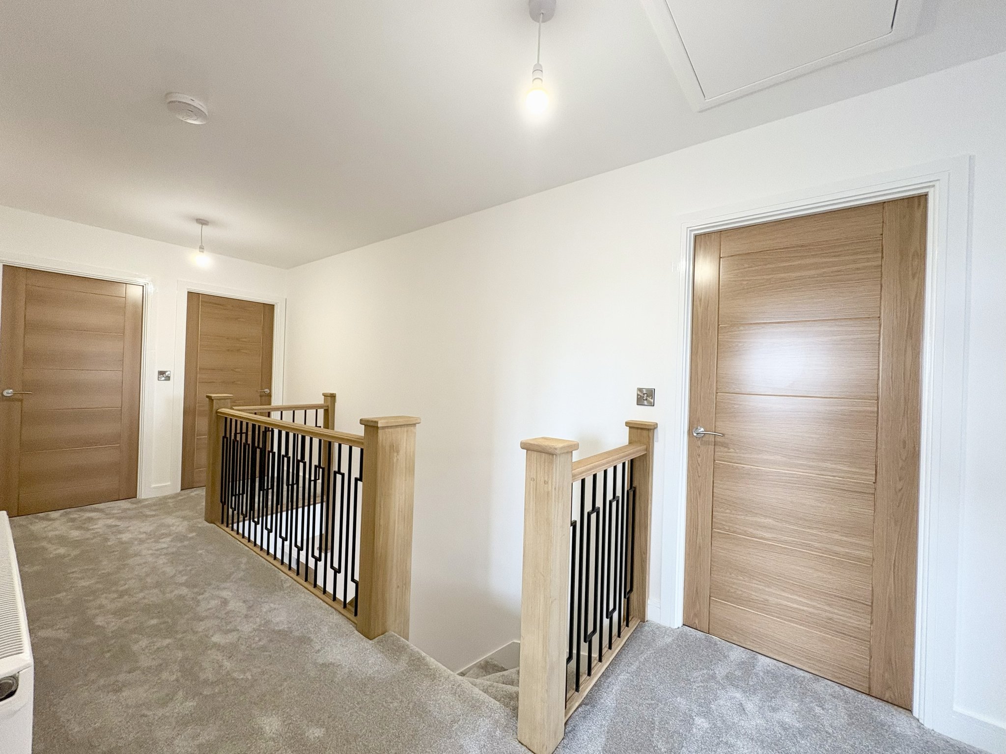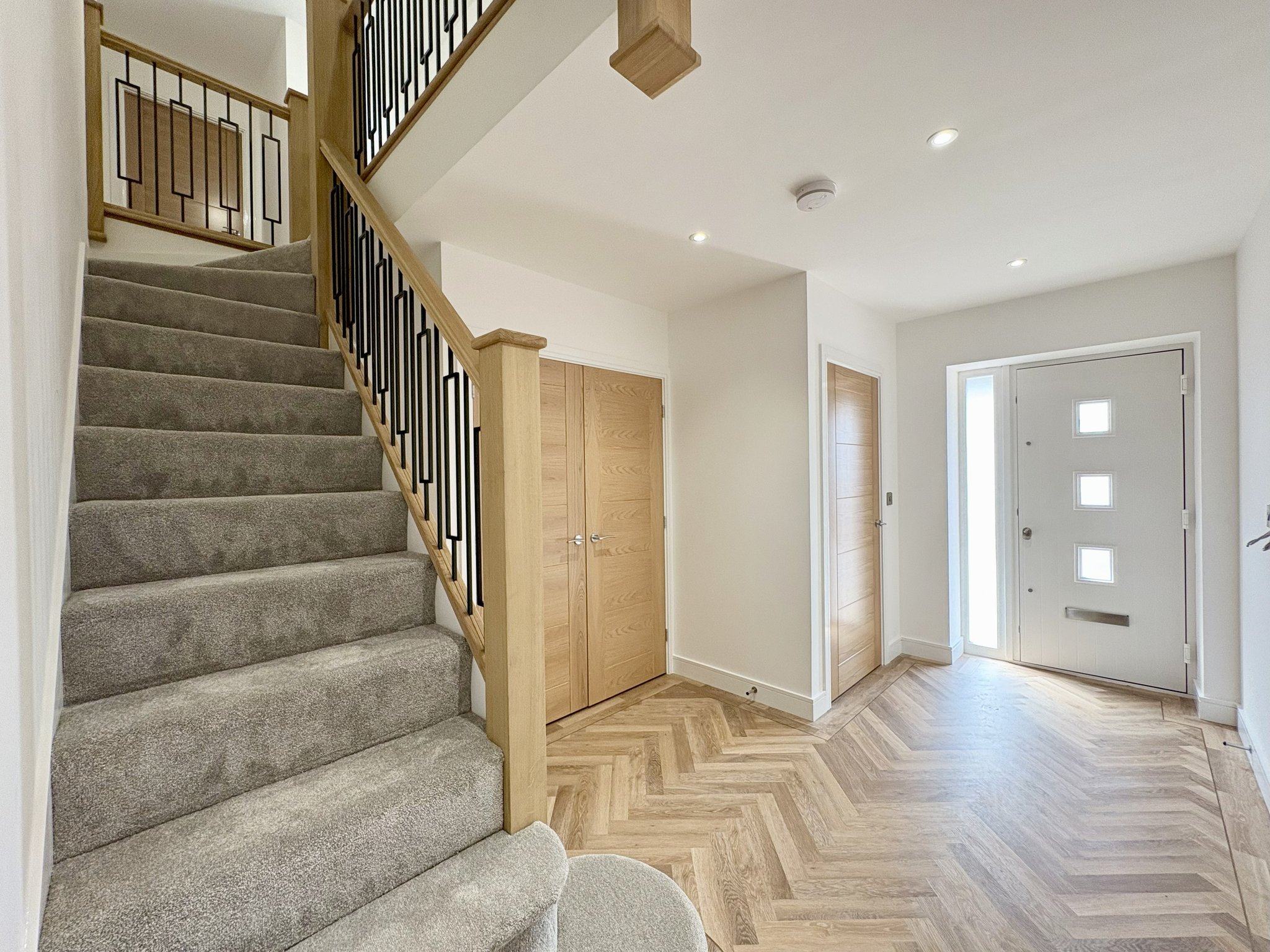 The spacious landing provides access to the principal bedroom, four further double bedrooms, and the modern family bathroom. It is well-lit with recessed spotlights throughout and features plush fitted carpet, adding warmth and comfort to the upper floor. The landing also continues the sense of space and quality that flows throughout the home.