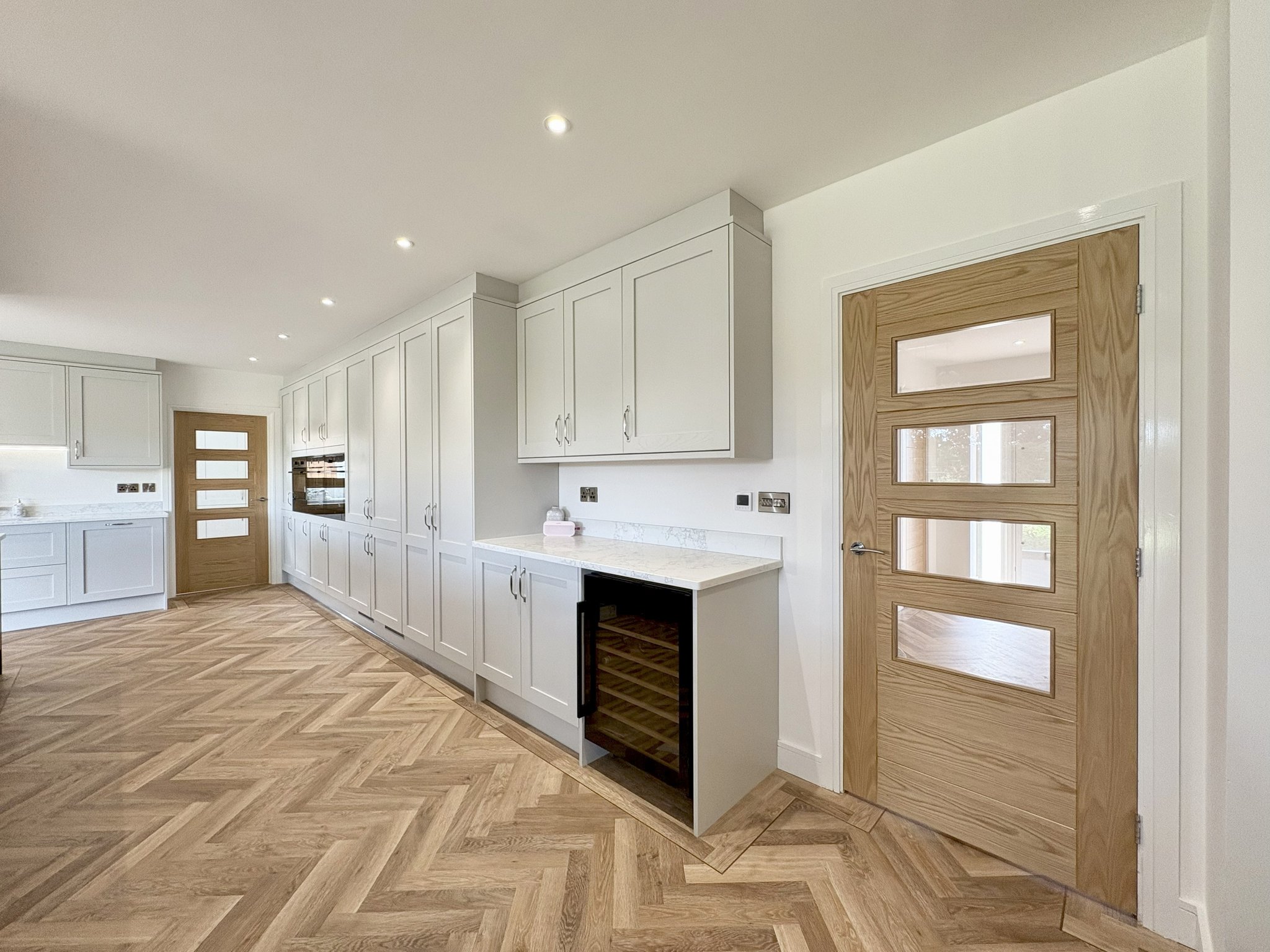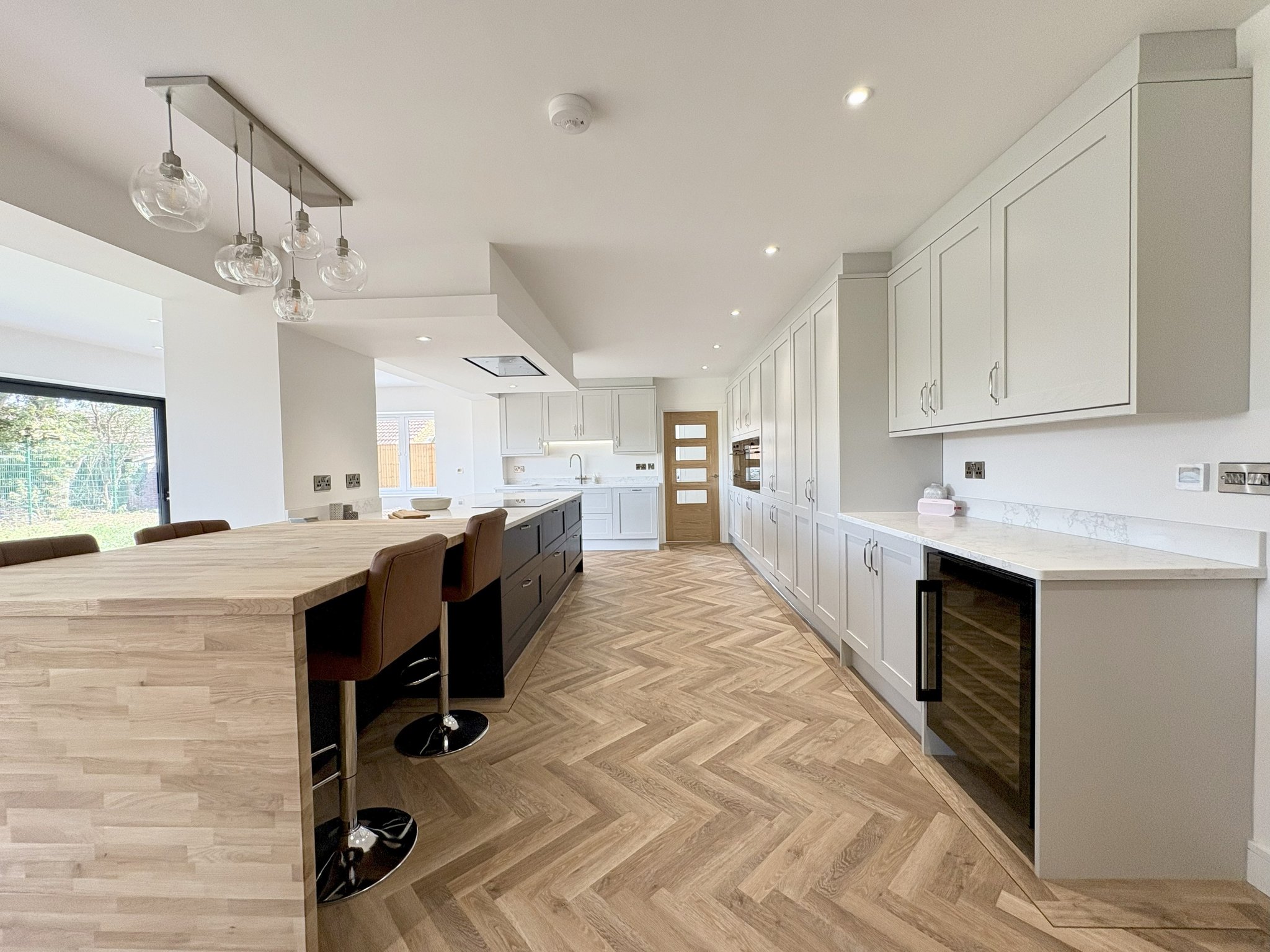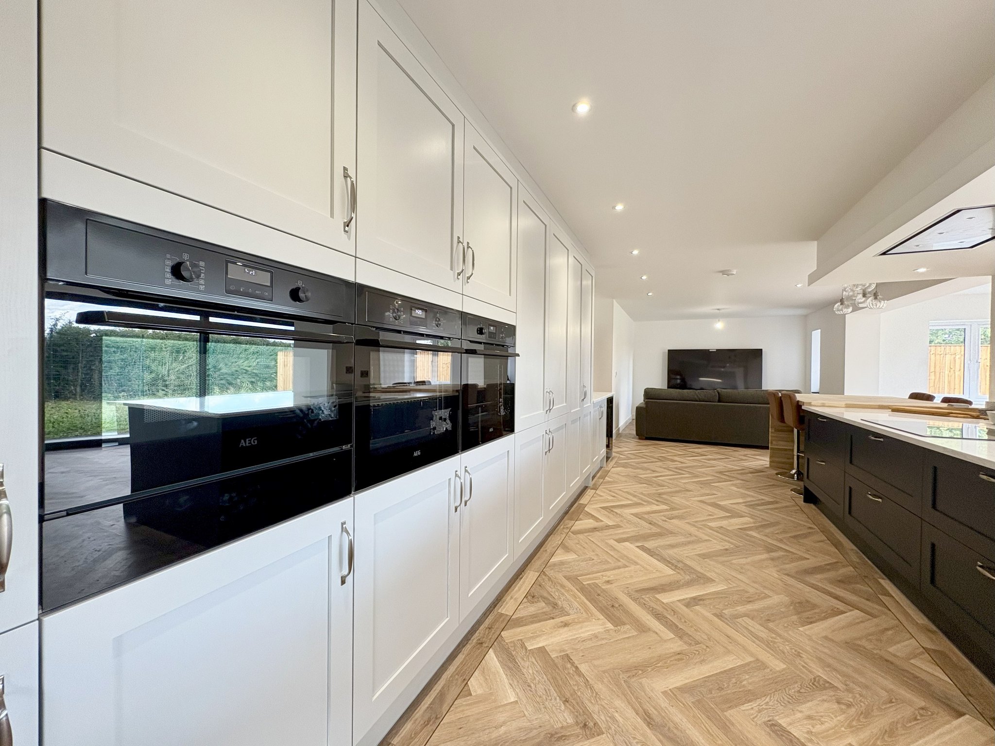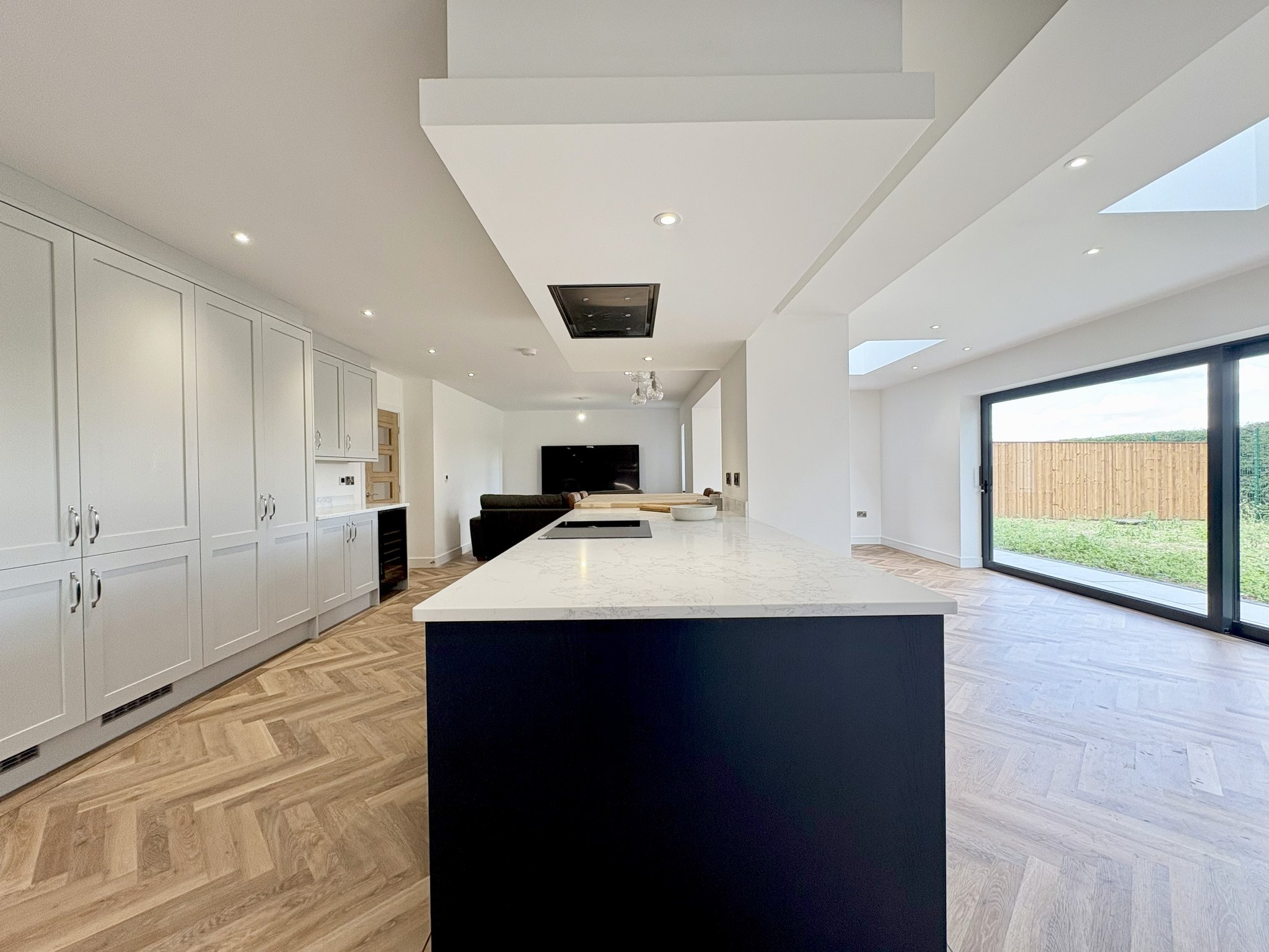 The heart of this home is the stunning kitchen, beautifully fitted with classic shaker-style wall and floor units, complemented by luxurious granite worktops. A large central island offers additional storage and serves as a stylish yet practical space for casual dining or gathering with family. There's also a generous dining peninsular, ideal for quick meals or entertaining guests. This well-appointed kitchen is equipped with a range of high-spec integrated appliances, including 2 ovens, microwave, plate warmer, 5-ring electric hob with extractor hood, dishwasher, two large fridge-freezers, and an impressive wine fridge that’s notably larger than standard. A state-of-the-art tap provides cold, warm, filtered cold, and instant hot water for ultimate convenience. The space is designed to accommodate both a full-sized dining table and a relaxed family seating area, making it a truly multifunctional room. Large sliding doors offer access to the rear garden which is private and not overlooked, seamlessly connecting indoor and outdoor living. Stylish lighting enhances the atmosphere, with a combination of recessed spotlights and statement pendant lights creating the perfect mood at any time of day. The wood-effect Karndean flooring continues from the hallway and is complemented by underfloor heating, adding warmth and comfort to this incredible space