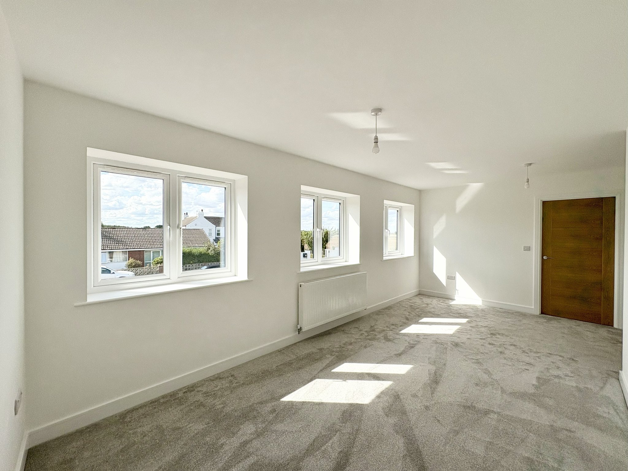 Bedroom two is located at the front of the property and benefits from three windows that fill the room with natural light. It includes a convenient storage cupboard, fitted carpet, a single pendant light fitting, and a radiator for added comfort. This bedroom also enjoys the luxury of its own en-suite bathroom, providing privacy and convenience.