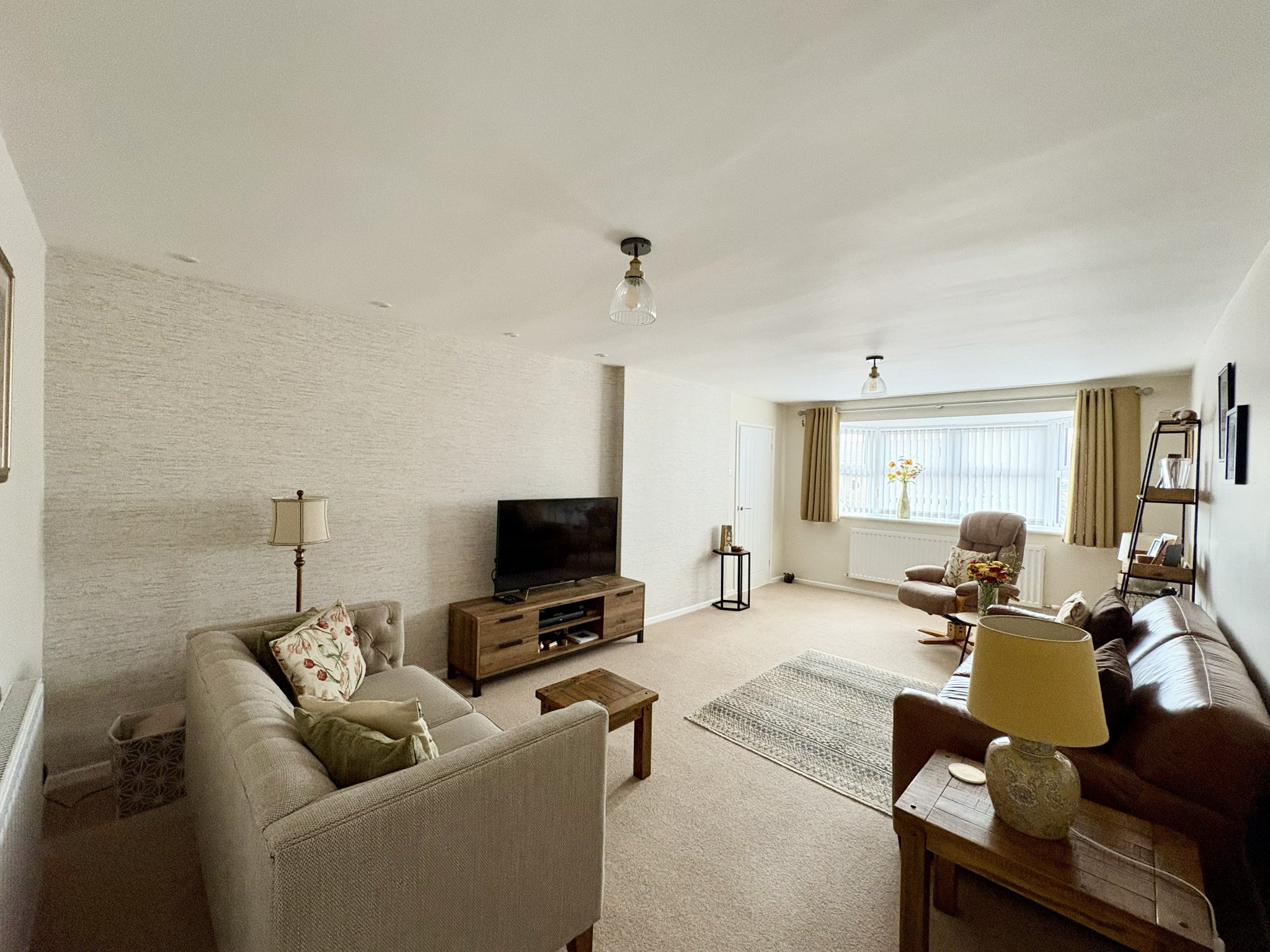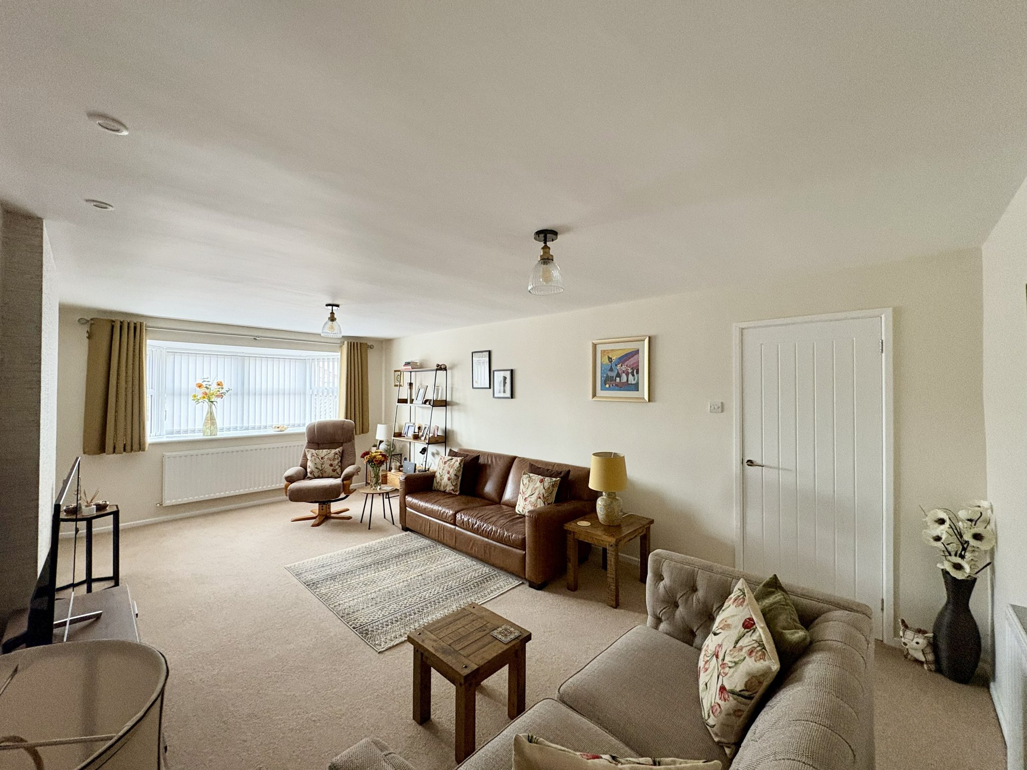 A spacious lounge which has been tastefully decorated to create a warm and welcoming atmosphere. A centrally positioned electric fire adds a cosy touch, while a bow window to the front aspect enhances the sense of space and light. The room is fitted with carpet to the floor, 2 single pendant light fittings and 2 radiators.