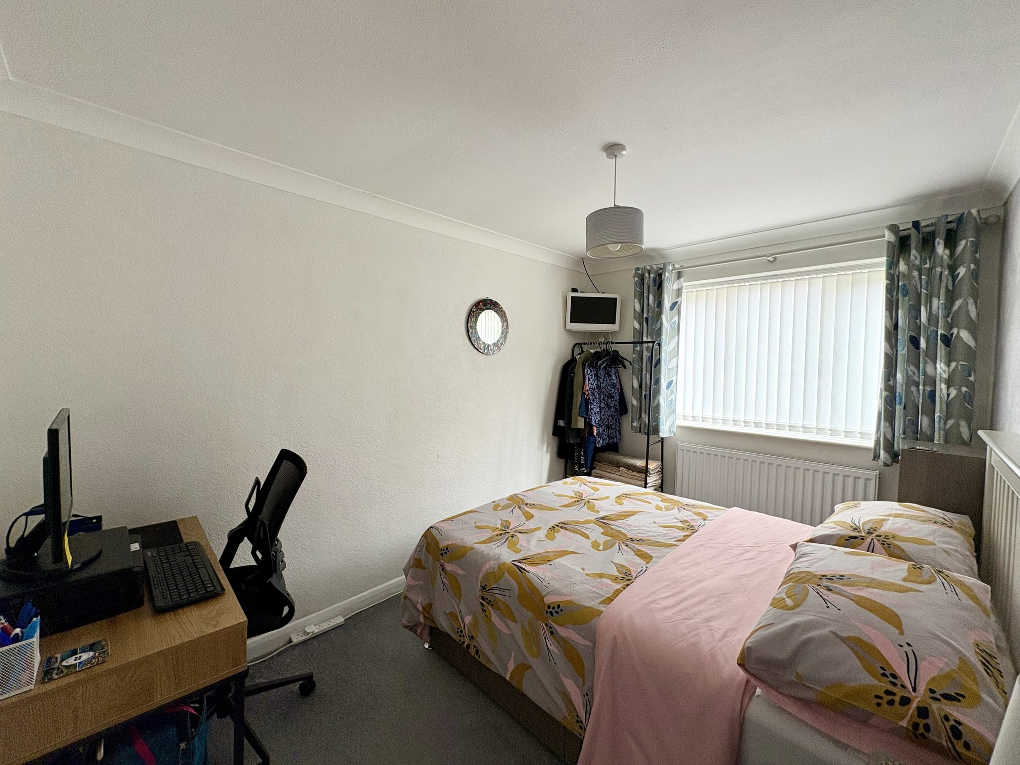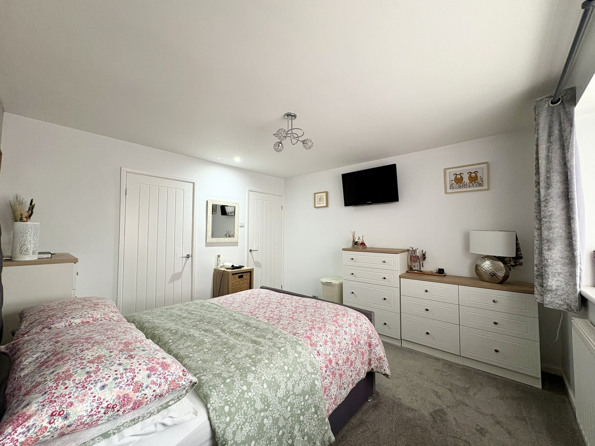 There are two double bedrooms, both generously proportioned. The principal bedroom is located at the front of the property and benefits from a walk-in wardrobe with side aspect obscure glass window, lighting and radiator, as well as additional space for freestanding furniture. The second bedroom sits to the rear, with views across the garden. Both bedrooms are fitted with carpet, have a radiator and single pendant light fitting.