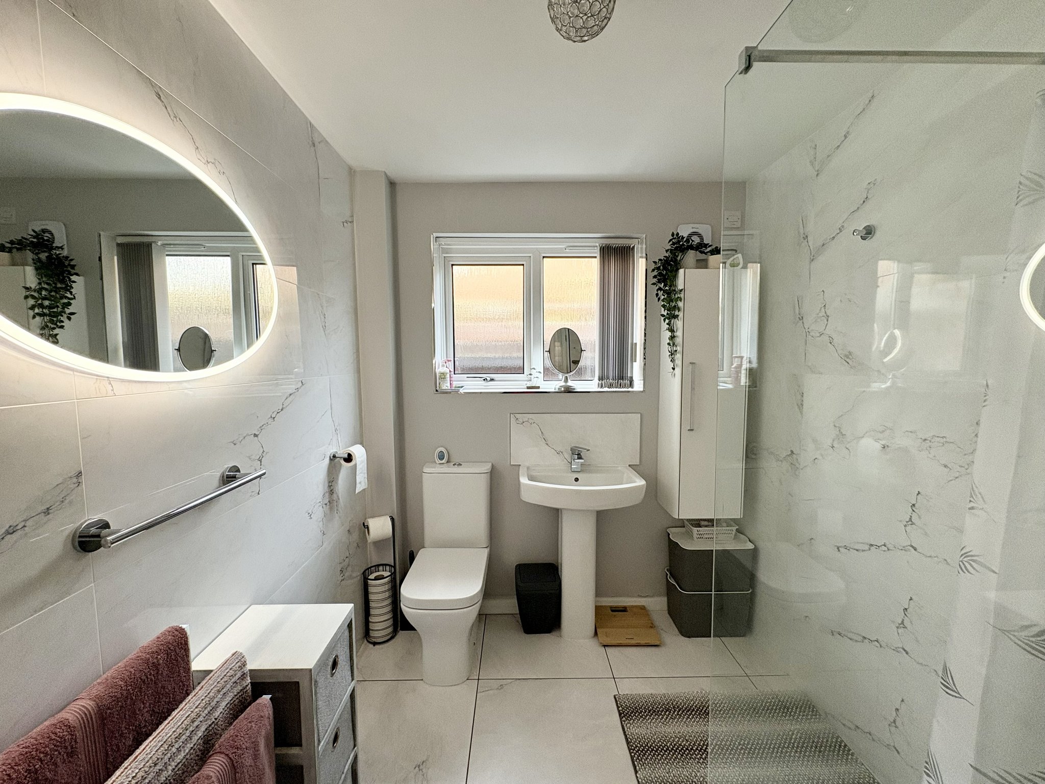 The high-specification fully tiled bathroom features a modern suite including a walk-in shower with glass enclosure, vanity basin, wc, and a built-in storage cupboard. Side aspect obscure glass window, radiator and single pendant light fitting.